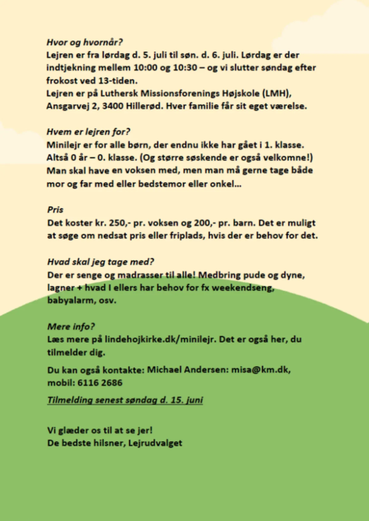 Minilejr er et helt døgn fyldt med god leg, spændende samlinger om Gud, sjove aktiviteter, skønne børnesange og meget mere!