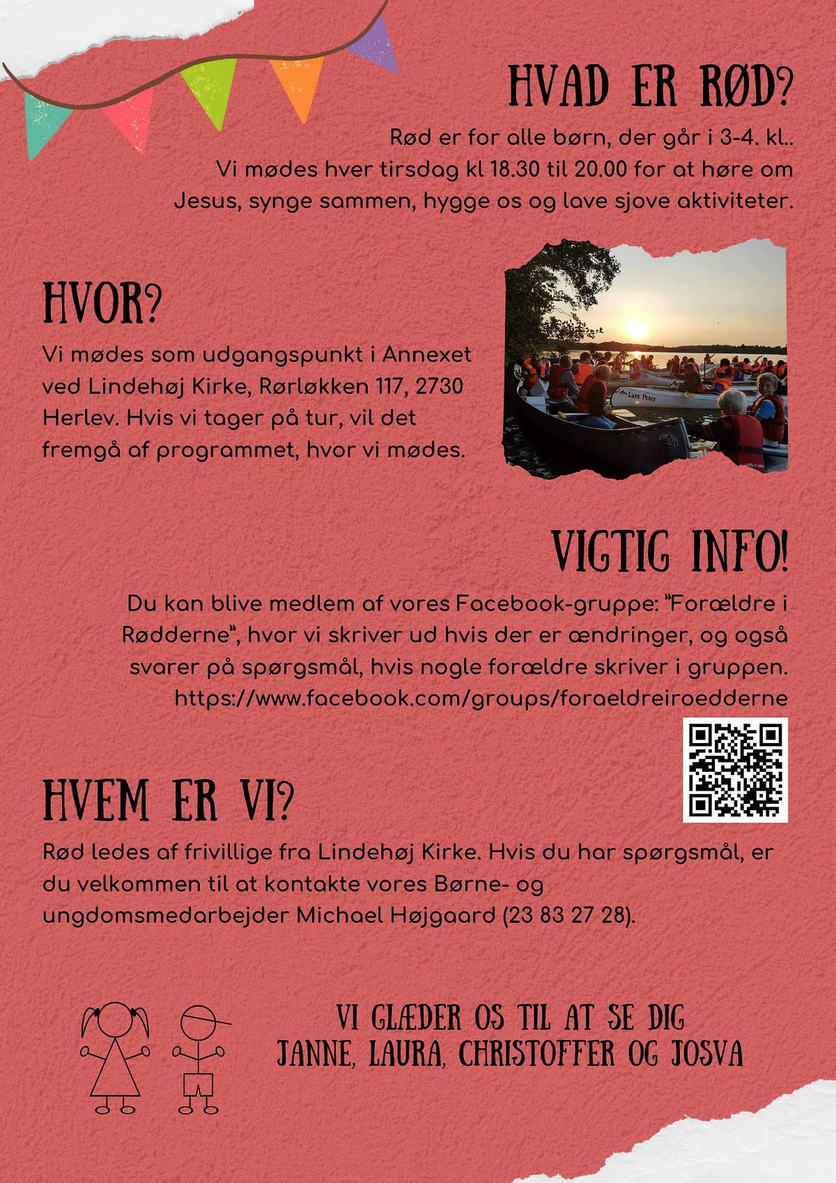 Rød er et skønt fællesskab for alle drenge og piger i 3. og 4. klasse, som har lyst til at høre om Gud og lave forskellige sjove aktiviteter. Aftener begynder altid med, at vi synger nogle sange, og at en leder fortæller noget om Gud fra Bibelen. Derefter laver vi forskellige aktiviteter som konkurrencer, skøre lege, sjove byggeprojekter og en masse andet. Kom, som du er!