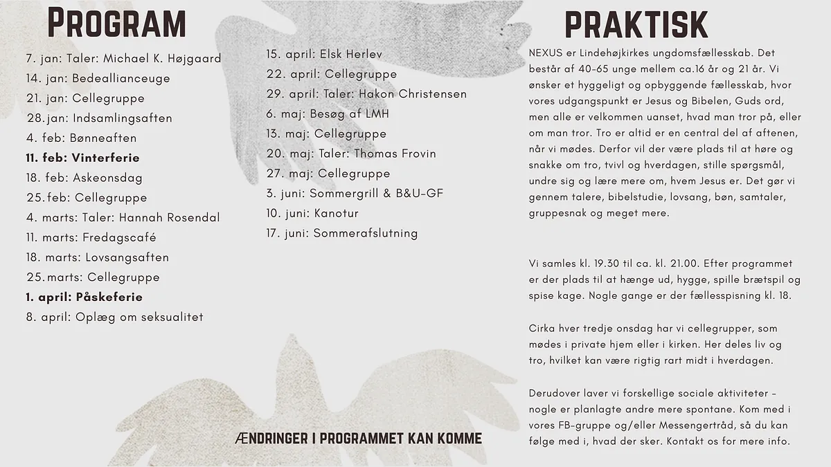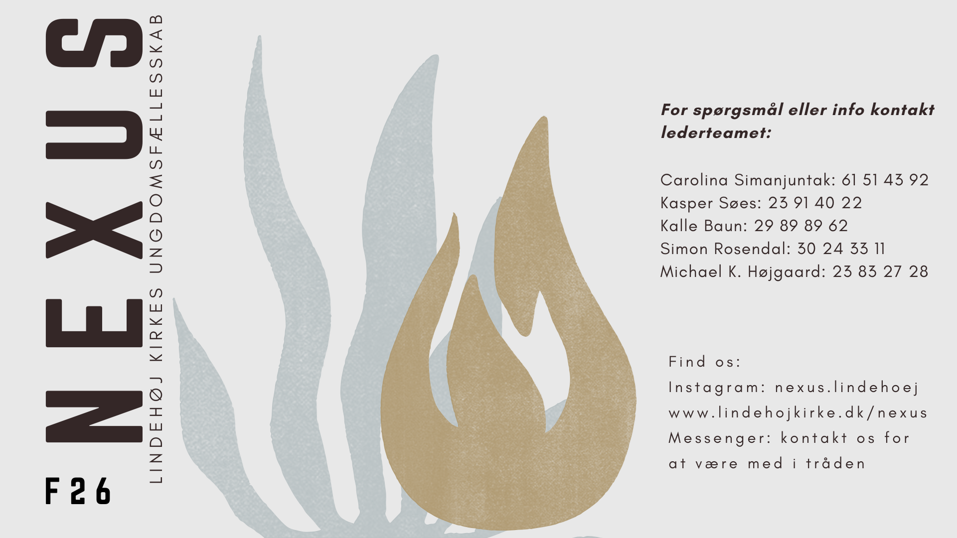 Find flere informationer på vores Instagram, hvor du kan få løbende opdateringer og se programmet. OG du kan også komme med i vores messengergruppe, hvor vi ugentlig giver info og opdaterer, hvad der sker i Nexus. Kontakt Michael Koefoed Højgaard (Børne- og ungdomsmedarbejderen) på tlf. 23 83 27 28, hvis du vil være med i vores messengergruppe.