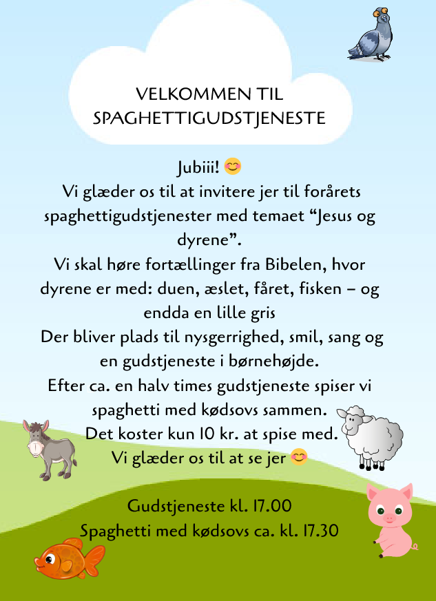 Gudstjenesten varer ca. 35 min, hvorefter der er spaghetti med kødsovs til 10 kr. pr. person.